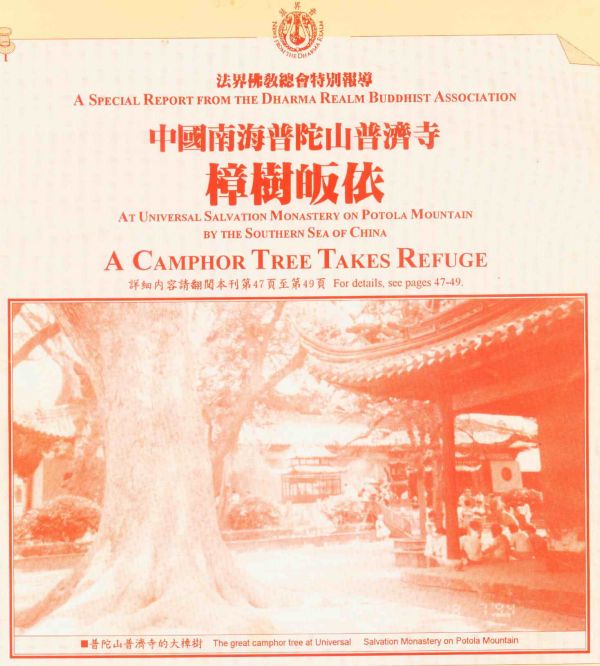 94年10月,上人弟子果卿 、果霖两位居士到普陀山礼佛, 普陀山普济寺里一棵千年古樟树神现身,说自己听上人讲经后因不明经义,而向两位上人弟子求解上人所讲心经的几句经义,两位居士好奇地问他:上人在美国讲经你怎么听得到?据樟树神讲,上人讲经尽虚空、遍法界都听得到,只有被财色名利所累的人们听而不闻视而不见,其他—切的众生,都是默默地在上人讲法的声音中薰修,培养菩提的种子。 所以,他已听宣公上人说法很久了。当时两位居士为其讲解了心经中所疑惑的部分,回来后通过越洋电话向上人汇报了此事,上人在10月23日在洛杉矶长堤圣寺为这位树神作了正式的皈依仪式。